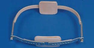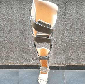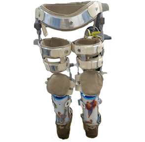 Tutor em duralumínio forrado com couro, com almofadas e acoplado a sapatilha. Para ser usado com tênis ou sapatos próprios. Com apoio isquiático.